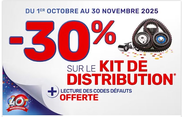 Le remplacement d'un kit de distribution, pourtant indispensable, fait partie des réparations automobiles les plus coûteuses. Pour limiter les frais, notre réseau AD vous propose une promo sur les kits de distribution. Cette offre, valable sur une période limitée, vous permet de profiter d'un kit de distribution pas cher et compatible avec votre modèle de voiture. Cette opération de promotion est proposée sur tout le territoire, dans les garages participants. Pour en profiter, effectuez une réservation en ligne et faites-en part à votre garagiste AD le plus proche afin de réduire votre facture lors de la pose d'un nouveau kit de distribution. Vous pourrez profiter d'un kit à prix bas ou d'une courroie de distribution pas chère selon les conditions en vigueur.